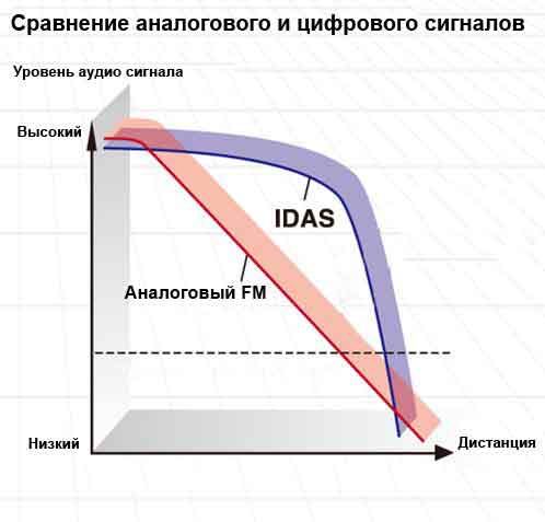 При использовании системы IDAS зона покрытия увеличивается на 20% по сравнению с FM системой. Кроме того, благодаря цифрому сигналу отсутсвуют посторонние шумы.